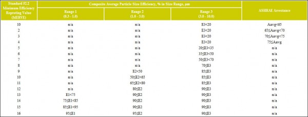 一個(gè)“整體”的報(bào)告值的52.2評(píng)??價(jià)空氣過濾器的最低能效報(bào)告的價(jià)值(MERV)的表達(dá)。MERV是單一的數(shù),即用,隨著在測(cè)試進(jìn)行的空氣速度,以簡(jiǎn)化的試驗(yàn)方法,所產(chǎn)生的大量數(shù)據(jù)。MERV表示上的16點(diǎn)的規(guī)模和來自從PSE的三組中的每個(gè)。(見表3:MERV參數(shù))。 平均PSE為每個(gè)三組(E1,E2和E3)是參照的最小效率報(bào)告值參數(shù)(見表3:MERV參數(shù))。向上移動(dòng)的適當(dāng)?shù)姆秶M(E1,E2和E3)在表3中,并記錄MERV到左側(cè)的第一個(gè)真正的語句。所有三組。 表3:MERV參數(shù)
